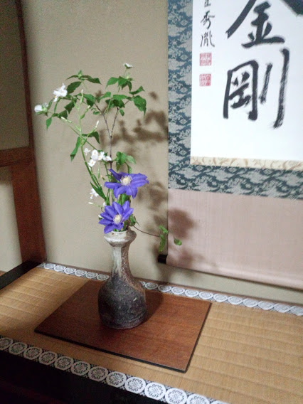 鉄線という痛そうな武器みたいな名前の花は、均整がとれた容姿でとても綺麗。せっかく丸卓の平点前がほぼ詰まらずに行ったのに、初めに袱紗をつけ忘れて台無し。次の唐物にまで響いてあまり上手くいかなかった。LV1のままほったらかしにしている金剛の怨念では多分ない。