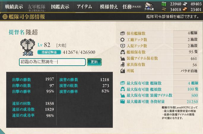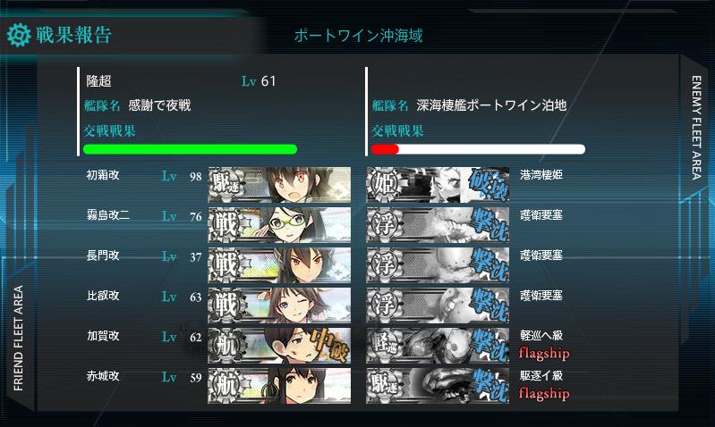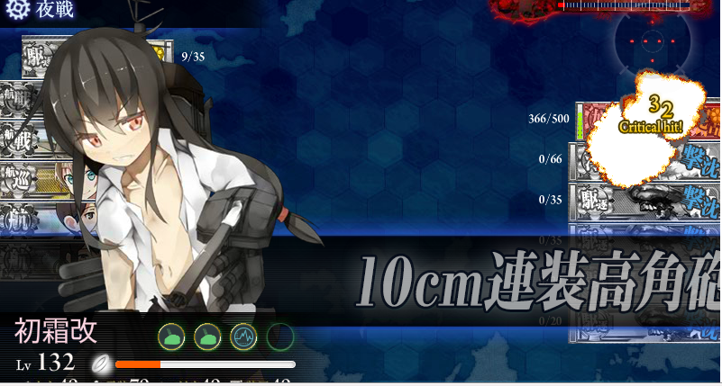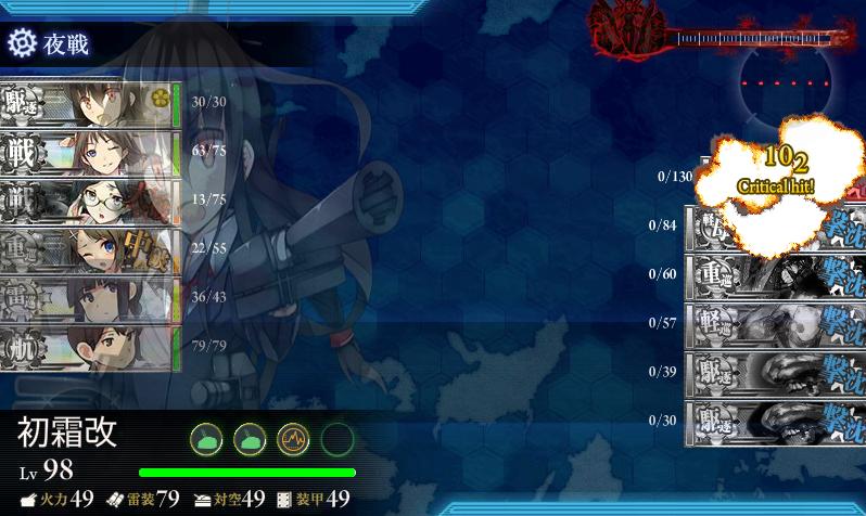 初霜は言うまでもなく、開始直後からメンバーで旗艦で秘書艦で切り込み隊長という矛盾したようなそうでもないような、しかしうちで一番愛でられている艦であることは間違いありません。ここまで思い入れを持てるのは十年に一度級なので、じっくりと大切にしていきたい(学生時代はよく考えずにコミュニティに参加して、リアルで嫌な思いをよくしましたから…)。