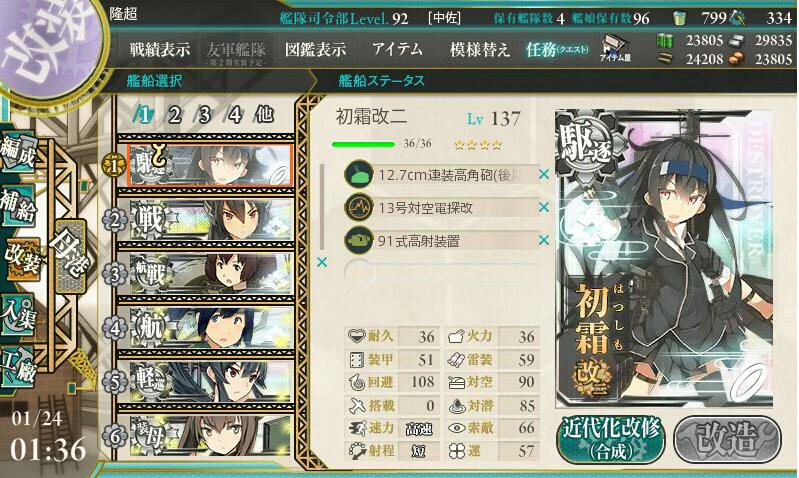 初霜改二が実装。元々初霜が好きでたまらなかった層には、概ね好意的に受け入れられており、駒の一つ、もしくは育成対象外と見ていた層には、わざわざ育成する程の価値があるか微妙に受け取られている様子。元々小柄で貧弱な装備の中、激戦をぎりぎりまで生き延びたのが初霜の大きな魅力なので、総じて史実を超越した過度な肩入れの無い、今まで好きだった人がこれからも愛で続けていける良調整だったと言えると思います。運営にこんな世界の端っこからの要望が届いていたとも思いませんが、かなりイメージ通りで満足です。